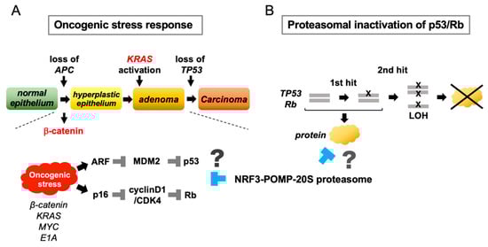 Conceptual hypotheses of the functional significance of NRF3 in cancer. The identification of the NRF3–POMP–20S proteasome axis allowed us to propose two conceptual hypotheses. (A) During the development of colorectal cancer, mutation of APC or β-catenin in the Wnt pathway is a crucial initial event that activates the oncogene β-catenin, and mutation of TP53 is the final event in carcinogenesis. In normal cells, activation of individual oncogenes, namely, “oncogenic stress“, activates p53 and Rb by stimulating the tumor suppressors ARF and p16, leading to cell cycle arrest and apoptosis. This response of normal cells confers cytoprotection against oncogenic stress. The NRF3–POMP–20S proteasome axis may eliminate the oncogenic stress response in normal cells to enable tumorigenesis. (B) The NRF3–POMP–20S proteasome axis represses the biological functions of p53 and Rb via proteasomal degradation. The advantage of this mechanism may be that repression occurs without a two-hit mutation of these genes.
