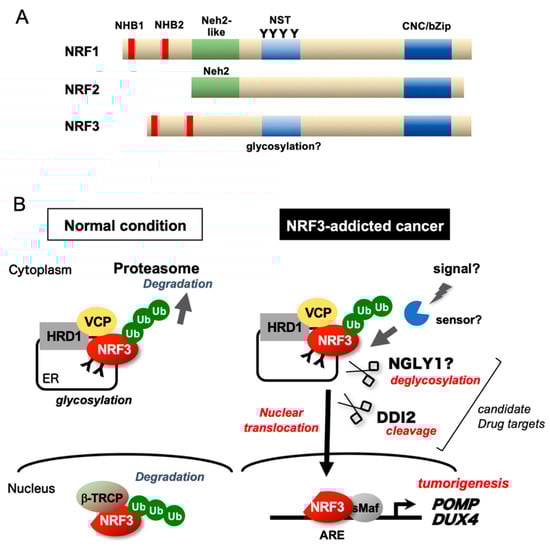 The absence of the Neh2 domain in NRF3 implies that NRF3 function is not controlled by KEAP1. Rather, NRF3 has N-terminal homology box 1/2 (NHB1/2) domains [,,,]; the NHB1 domain sequesters NRF3 in the endoplasmic reticulum (ER), and the NHB2 domain contains the proteolysis site for the aspartic protease DNA damage-inducible 1 homolog 2 (DDI2). Under normal conditions, NRF3 is glycosylated and sequestered in the ER and is further degraded by the endoplasmic reticulum-associated degradation (ERAD) ubiquitin ligase HRD1 [], which suppresses its function (Figure 5B). Accordingly, as in the case of oxidative stress in the NRF2 pathway, NRF3-activating stress and/or signals and their sensor molecules should exist. The fact that NRF3 functions in cancer cells means that NRF3-activating stress occurs in cancer cells. The activating signal is likely to induce the nuclear entry of NRF3 by stimulating DDI2-mediated cleavage of NRF3, thereby releasing NRF3 from repression mechanisms. We have determined that the DDI2 cleavage site is the AWLVH motif in the NHB2 domain of NRF3 []. Similar to the case for NRF1, this processing appears to require the deglycosylation of NRF3 by the enzyme NGLY1 [,], the product of the gene responsible for the NGLY1-deficiency disease, a congenital disorder []. Additionally, cleavage by DDI2 and the yeast homolog DNA damage-inducible protein 1 (DDI1) requires polyubiquitination of substrates [,]. Indeed, knockdown of HRD1, which is the E3 ubiquitin ligase of NRF3 in the ER, leads to the significant accumulation of NRF3 proteins in the cytoplasm.