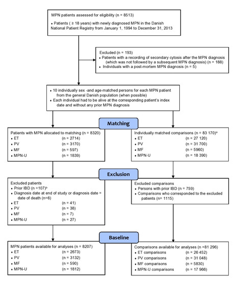 Flowchart of included MPN (myeloproliferative neoplasm) patients (ET (essential thrombocythemia), PV (polycythemia vera), MF (myelofibrosis), and MPN-U (unclassifiable MPN)) and sex- and age-matched comparisons. a For a few patients <10 comparisons could be matched due to old age. b The prevalence of IBD (inflammatory bowel disease) at the time of MPN diagnosis is shown in Table 1.