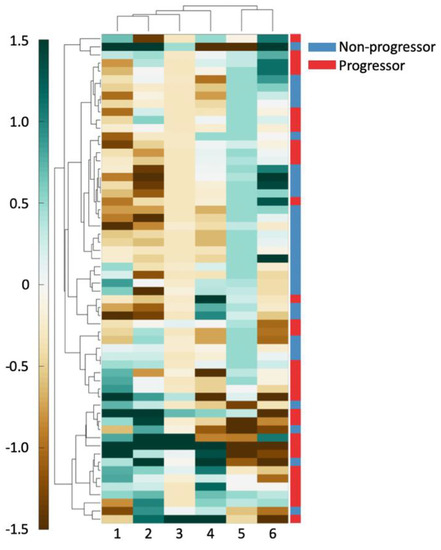 The 6 features used to create a clustergram on D1. Features and patients were clustered hierarchically. The shading of each cell shows the relative over- or under-expression of that feature in a patient. From left to right, the features are: (1) standard deviation of minimum/maximum nuclear radius, (2) minimum/maximum nuclear perimeter, (3) minimum/maximum ratio of Voronoi polygon perimeter, (4) standard deviation of nuclear shape’s Fourier descriptor 6, (5) tensor contrast inverse moment range, and (6) standard deviation of Voronoi polygon area.