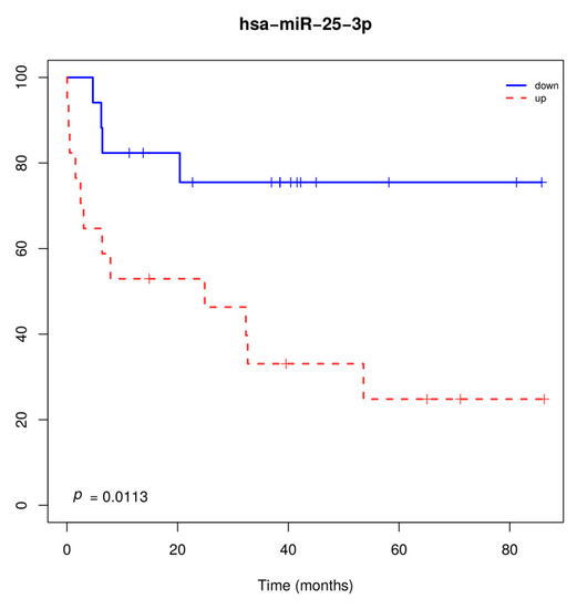 Overall survival of patients with lung carcinoma regardless of the histological subtype, according to miR-25-3p expression levels. Overexpression of miR-25-3p was associated with shorter overall survival.