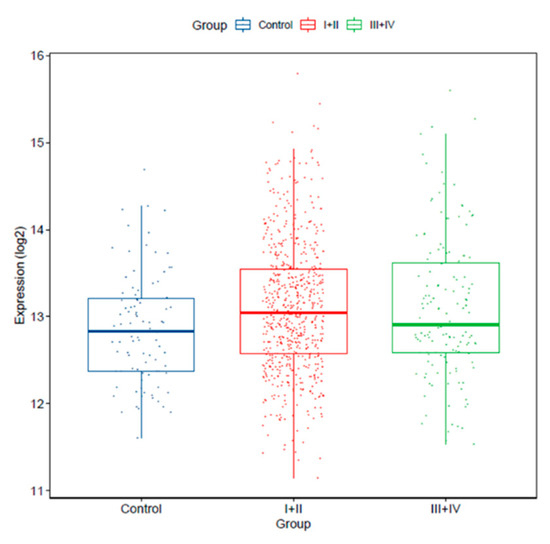 In addition, we verified miR-25-3p expression in earlier stages (I/II; n = 639) and more advanced stages (III/IV; n = 147) tumors versus controls. We found that miR-25-3p expression was significantly increased in stage I and II tumors vs. controls (p = 0.01022), and in more advanced stage tumors vs. controls (p = 0.02359). miR-25-3p expression levels were not significantly different between tumors from stages I/II vs. III/IV (p = 0.4397; Figure 3).