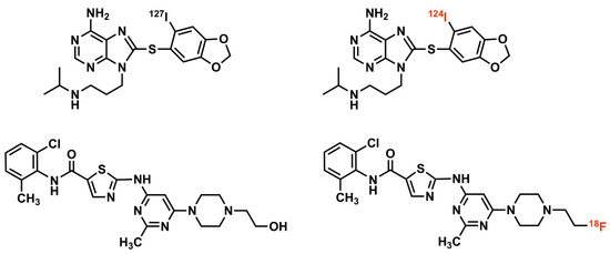 Our group developed a radiolabeled analog of the therapeutic tyrosine kinase inhibitor dasatinib [9] for PET imaging. Tumor resistance to dasatinib can involve altered tumor pharmacokinetics [73,74,75,76,77,78,79]. Resistant tumors may actively remove dasatinib (e.g., by efflux pumps) [73,74,75] or have mutations in kinase targets that prevent dasatinib binding [73,74,75,80].