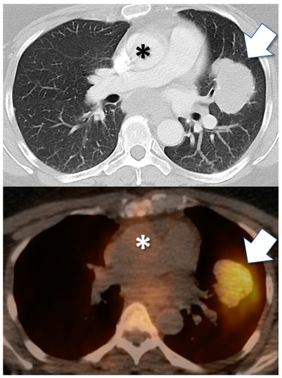 Drug tracer imaging detects in vivo tumor avidity for therapeutic small molecule compounds. Axial CT (top) and PET/CT fusion (bottom) images from 57-year-old female with clear cell carcinoma of Müllerian origin, including biopsied malignant pulmonary mass (arrow). PET/CT image obtained 24 h after injection with I-124 PU-H71 radiotracer, an isotopologue of the epichaperome inhibitor therapeutic compound PU-H71. PET demonstrates marked retention of drug by tumor, after drug has cleared from blood circulation (e.g., cardiac blood pool, asterisk).