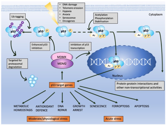 Next, MDM2 protein, at mild stress, monoubiqutinates p53, enforcing its nuclear export and enabling p53 non-transcriptional activity. MDM2 activity towards p53 is enhanced by its homolog, MDMX protein, which lacks the E3 ligase activity but binds to the N-terminus of p53 and MDM2 alike, inhibiting its transcription function [16]. Apart from MDM2, other ligases play a role in altering p53 stability like Trim family members or Pirh or bacterial or viral proteins, such as SV40 or E6 protein of the HPV virus [17]. It is, however, the MDM2–p53 hub that is responsible for regulating multiple cellular processes in human cells, such as apoptosis, cell cycle, DNA repair, antioxidant response or senescence as well as metabolism (Figure 1) [13]. Furthermore, p53 also regulates ferroptosis, iron-related cell death and has the transcription-independent function in apoptosis (binding to Bcl2-family of proteins), in miRNA maturation (binding to Drosha-complex proteins) and in DNA repair [18]. Its pivotal role is to orchestrate the response to genotoxic, oxidative, and oncogene-induced stress [19].
