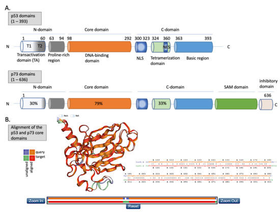The structures of p53 and p73. (A) Upper panel—domains in p53 protein. Lower panel—percentage homology of residues between p53 and p73 are presented and the values are indicated for each individual structural domain. T1, T2—transactivation domain (TAD) 1 and 2; NLS—nuclear localization signal; NES—nuclear export signal; SAM—sterile alpha-motif. Adapted from Tanaka et al. [32], Joanna Zawacka-Pankau et al. [33] and Melino et al., [34]. (B) Structure alignment of p53 core domain (PDB ID 2AC0 [8]) and p73 core domain (PDB ID 4G82 [35]) generated using Top Match Services with opacity of unmatched pairs of 0.7. https://topmatch.services.came.sbg.ac.at/index_ngl.html [36]. At the C-terminus, the regulatory basic domain is located [37] which is involved in the interactions with DNA through non-specific DNA binding allowing for distinctive target gene recognition by p53 and p73 [38].