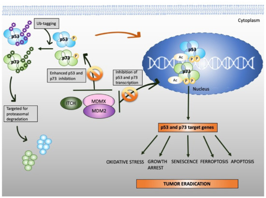 Reinstatement of p53 and p73 to treat cancer. Both p53 and p73 are rendered inactive in tumor cells through enhanced ubiquitination by MDM2/MDMX and MDM2/MDMX/ITCH axis, respectively. In addition to enhanced protein degradation, the transcriptional activity of p53 and p73 is inhibited through binding to MDM2 and MDMX. Targeting protein-protein interactions with small molecules or peptidomimetics (orange, crossed circles) stabilizes p53 and p73 and restores their transcription function (orange arrow). This, in turn, promotes tumor eradication through multiple mechanisms, as depicted in the scheme.