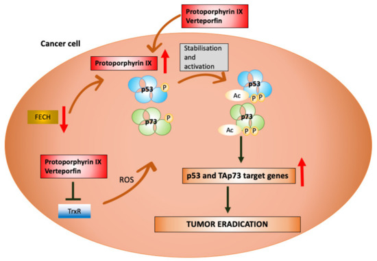 Repurposing porphyrins for improved cancer therapy. The low activity of ferrochelatase (FECH) in cancer cells leads to elevated levels of protoporphyrin IX (PpIX). High levels of PpIX sensitize malignant cells to exo-PpIX and Verteporfin, which bind to p53 and TAp73, stabilize the proteins, and induce p53- and TAp73-dependent transcriptional activity and apoptosis. Inhibition of thioredoxin reductase (TrxR) by PpIX and Verteporfin generates ROS and amplifies p53-dependent and TAp73-dependent apoptosis in cancer cells.