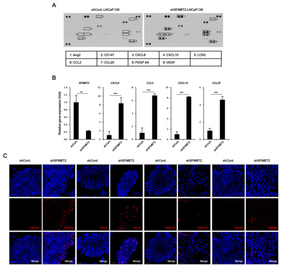 Down-regulation of SFMBT2 up-regulates the expression of chemokine genes in prostate cancer. (A) Increased expression of chemokines in LNCaP cells stably transfected with SFMBT2 shRNA. Culture media (CM) from LNCaP cells stably transfected with control (shCont) or SFMBT2 shRNA (shSFMBT2) were incubated with cytokine antibody array membrane. (B) Increased expression of CXCL8, CCL2, CXCL10, and CCL20 genes in LNCaP cells stably transfected with SFMBT2 shRNA. RNA was analyzed in LNCaP cells stably transfected with control or SFMBT2 shRNA. (C) Increased expression of CXCL8, CCL2, CXCL10, and CCL20 in prostate cancer induced by intraprostatic injection of LNCaP cells stably transfected with SFMBT2 shRNA. LNCaP cells (1 × 106 cells) transfected stably with control or SFMBT2 shRNA were injected into the prostate (dorsal lobe) of nude mice (n = 3/group). At week 5 post-injection, the prostate was harvested, fixed, sectioned, and immunostained with anti-CXCL8, anti-CCL2, anti-CXCL10, and anti-CCL20 antibodies. Representative images are shown. Nuclei were identified using DAPI staining. Scale bar, 25 μm. Expression was quantified using the ImageJ program. (D) Increased expression of CXCL8, CCL2, CXCL10, and CCL20 in prostate cancer tissues of patients. Immunohistochemical staining of a tissue array from prostate cancer patients was performed using anti-CXCL8, anti-CCL2, anti-CXCL10, and anti-CCL20 antibodies. Representative images are shown. Nuclei were identified using DAPI staining. Scale bar, 25 μm. Expression was quantified using the ImageJ program. (E) Proportional relationship of Gleason scores (GS) with the expression level of CXCL8, CCL2, CXCL10, and CCL20 in prostate cancer tissues of patients. (F) Inverse relationship of SFMBT2 expression with the expression level of CXCL8, CCL2, CXCL10, and CCL20 in prostate cancer tissues of patients. All data represent mean ± S.E.M. Significance values were ** p ≤ 0.01 and *** p ≤ 0.005.