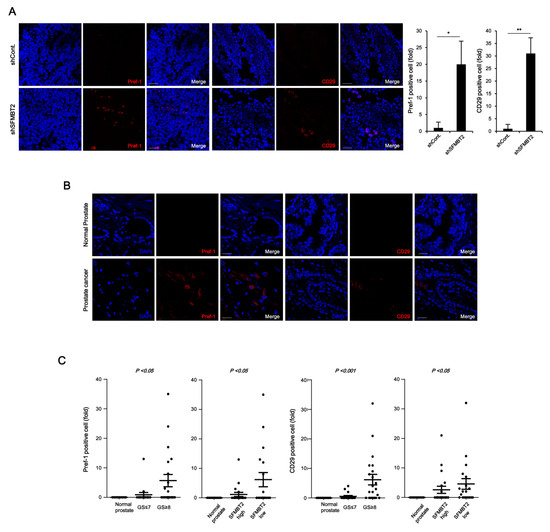 We next investigated whether SFMBT2 regulates the infiltration of adipocytes and TAMs by up-regulation of chemokine expression in prostate cancer. Because there were no obvious morphological and biochemical characteristics of adipocytes in prostate cancer tissues induced by intraprostatic injection of LNCaP cells stably transfected with SFMBT2 shRNA (data not shown), we decided to examine infiltration of preadipocytes, which may play an important role in prostate and breast cancer metastasis [33,34,35,36]. We first examined the expression of preadipocyte markers such as Pref-1 and CD29 [33,37]. Immunohistochemical analysis indicated increased numbers of Pref-1 and CD29 positive cells in prostate cancer induced by intraprostatic injection of LNCaP cells stably transfected with SFMBT2 shRNA (Figure 2A). We consistently found that the number of Pref-1 or CD29 positive cells is increased in prostate cancer tissues compared with normal prostate tissues using human normal and prostate cancer tissue array (Figure 2B,C). As with the expression level of CXCL8, CCL2, CXCL10, and CCL20, the number of Pref-1 or CD29 positive cells was increased in prostate cancer tissues with high Gleason scores of ≥8 (Figure 2C). In addition, the SFMBT2 expression level was inversely related to the number of Pref-1 or CD29 positive cells (Figure 2C).