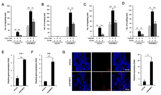 It is known that cells infiltrated into the tumor microenvironment critically contribute to prostate cancer progression via secretion of various paracrine factors such as cytokines and growth factors [7,89]. In this study, we found that IL-6 derived from 3T3-L1 preadipocytes and TAMs promotes migration and invasion of LNCaP cells. IL-6 mediated cell migration and invasion were enhanced in SFMBT2 knockdown LNCaP cells compared with control shRNA-transfected LNCaP cells. In addition, IL-6 expression was proportionally related to a high Gleason score of ≥8 and increased in prostate cancers expressing a low level of SFMBT2. Consistent with our findings, high levels of IL-6 were detected in prostate cancer tissues and sera of patients with advanced prostate cancer [90,91,92,93,94]. In addition, IL-6 promotes prostate cancer cell growth, invasion, migration, and epithelial-mesenchymal transition (EMT), resulting in metastasis [95,96,97].