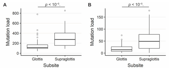(A) Overall SNV mutation load in supraglottic and glottic LSCC. Glottis median value 113.0, interquartile range (IQR) 76.0; supraglottis median 273.0, IQR 247.5. (B) G>T SNV mutation load in supraglottic and glottic LSCC. Glottis median 13.50, IQR 19.00; supraglottis median 48.5, IQR 58.25. The number of SNVs per tumor differs significantly between supraglottic and glottic LSCC (p < 10−5).