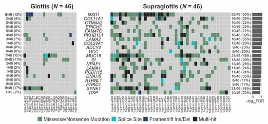 The SNV mutational load was reported from exome sequencing per tumor as previously described [19,20]. Analysis of exome sequencing data revealed that the total SNV mutational load was significantly higher for supraglottic compared to glottic cancers (glottis: median 113.0, interquartile range (IQR) 76.0; supraglottis: median 273.0, IQR 247.5, p < 10−5, Figure 1A). Fifteen genes demonstrated more frequent SNVs in the supraglottic cancers (FDR < 0.1, Figure 2). The genes with the most SNV mutations overall within the cohort can be found in Figure S2. NSD1 SNVs demonstrated the greatest differential mutation rate, with 50% of supraglottic LSCC cases harboring alterations versus only 13% in the glottis (FDR = 0.076). It is widely accepted that G>T transversions in HNSCC are associated with patient smoking history [19,20], so we also specifically analyzed the difference in SNVs of this type between subsites. This revealed a higher overall G>T mutation load in the supraglottis (glottis: median 13.50, IQR 19.00; supraglottis: median 48.5, IQR 58.25, p < 10−5, Figure 1B). DNAH5 was the only gene found to have a differential rate of G>T transversions, occurring in 20% of supraglottic carcinomas and 0% of glottic LSCC (FDR = 0.043, Figure S3). Analysis of the mutational distribution of DNAH5 SNVs across the gene revealed a pattern suggesting the gene may function as a putative tumor suppressor given the broad distribution of the alterations and absence of hotspot sites [21] (Figure S4).