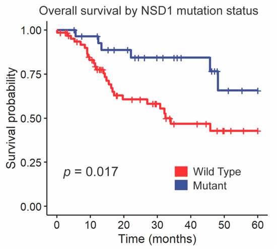 Kaplan-Meier curves for overall survival by NSD1 SNV mutation status. A log-rank test was used to compare the Kaplan-Meier curves between tumors with wild-type and mutant alleles.