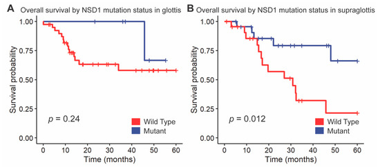 Kaplan-Meier curves for overall survival by NSD1 mutation status, stratified by (A) glottis and (B) supraglottis. A log-rank test was used to compare the Kaplan-Meier curves between tumors with wild-type and mutant alleles.