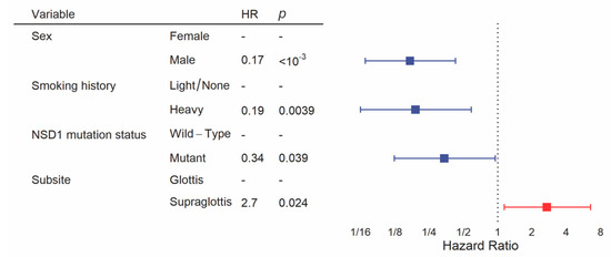 We constructed the multivariate model starting with clinical variables and NSD1 mutation status, as we have done previously [19]. Backward selection included sex, smoking history, subsite and NSD1 mutation status in the final model for overall survival. This revealed a significant difference in overall survival between subsites after controlling for other clinical variables and NSD1 mutation status, with significantly poorer prognosis in the supraglottis (HR = 2.7, 95% CI = 1.1–6.5, p = 0.024, Figure 5, Table S1). In addition, male sex (HR = 0.17, 95% CI = 0.069–0.43, p < 10−3), heavy smoking history (HR = 0.19, 95% CI = 0.063–0.59, p = 0.039) and NSD1 mutation (HR = 0.34, 95% CI = 0.12–0.95, p = 0.0039) were favorably prognostic within this multivariate analysis.