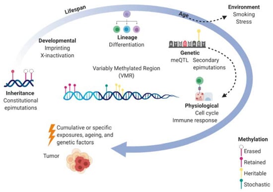 Dynamics of the methylome over the lifespan and the contribution to cancer. Within a variably methylated region (VMR) for a particular cell, the methylome can be shaped by molecular factors (inside circle) such as inherited methylation marks, developmental processes, cellular differentiation, genetic sequence, and physiological states which are shown to be dependent on genetics as well. Environmental factors also effect methylation where epimutations not only accumulate over time but have larger effects on methylation with ageing. The cumulative effects of genetic, epigenetic, and environmental exposures contribute to the development of cancer.