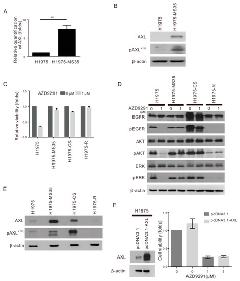 Since overexpression of AXL is known as an important driver of drug resistance to targeted therapies, immunotherapies, and chemotherapy in various animal models [19,20,21] and has been shown to modulate patients resistant to erlotinib in lung cancer patients [22], we investigated whether AXL overexpression is involved in the TKI resistance associated with acquired EGFR C797S. First, we confirmed that AXL is clearly overexpressed in H1975-MS35 cells compared to H1975 cells by RT-PCR and Western blotting (Figure 2A,B). To address the question of whether the acquisition of the EGFR C797S mutation results in the upregulation of AXL, we examined the effects of ectopic expression of EGFR C797S on the expression of AXL. Similar to the results obtained with H1975-MS35 cells, stable expression of exogenous EGFR C797S in H1975 (H1975-CS) cells resulted in resistance to AZD9291 (Figure 2C), resistance to AZD9291 inhibition of EGFR phosphorylation and downstream signaling (Figure 2D), and upregulation of AXL expression (Figure 2E).