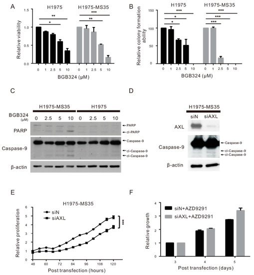 Effects of AXL inhibition in NSCLC cell lines carrying EGFR C797S. (A) H1975 and H1975-MS35 cells were treated with various concentrations of BGB324 for 24 h. The viability of treated cells was detected by staining with trypan blue. (B) H1975 and H1975-MS35 cells were treated with various concentrations of BGB324 for 24 h and then cultured for an additional eight days in the absence of drugs. The number of foci was scored. (C) H1975-MS35 and H1975 cells were treated with BGB324 for 24 h, and the cell lysates were assayed for the cleavage of PARP and caspase-9 by Western blotting. (D–F) H1975-MS35 cells were transfected with si-N (control) or siAXL and cultured for 48 h. The transfected cells were examined for the expression level of AXL and cleaved caspase-9 by Western blotting (D), for cell proliferation by xCELLigence real-time cell analyzer (E), and for AZD9291 sensitivity by MTT (F). The data shown in A, B, E, and F represent the mean ± SD from three independent experiments; * p < 0.05, ** p < 0.01, and *** p < 0.001 as calculated using Student’s t-test. The data shown in (C,D) are from one of three similar results.