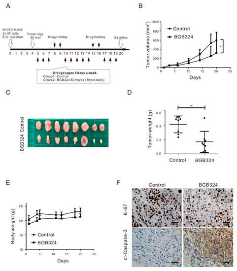 Effect of BGB324 on tumor growth of H1975-MS35 cells in vivo. (A) Experimental design for the treatment protocol of H1975-MS35 cells in vivo. H1975-MS35 cells (2 × 106) were inoculated subcutaneously into the right flank of nude mice. Mice were randomly assigned into two groups (n = 8 per group) to receive treatment with BGB324 as shown in the diagram. (B) Tumor volume progression. (C) Sizes of excised tumors. (D) Tumor weights at the end of the study. (E) The effect of treatment on the body weights of mice. Data are represented as the mean ± SD of values from eight mice; * p < 0.05 and ** p < 0.01, as analyzed using Student’s t-test. (F) IHC staining of Ki-67 and cleaved caspase-3 in the excised tumor sections.