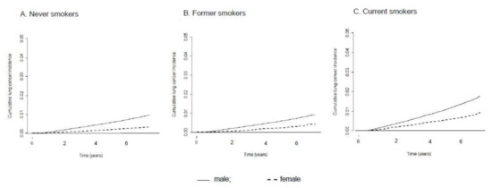 Cumulative lung cancer incidence in men and women according to smoking status. (A) Never smokers, (B) Former smokers and (C) Current smokers.