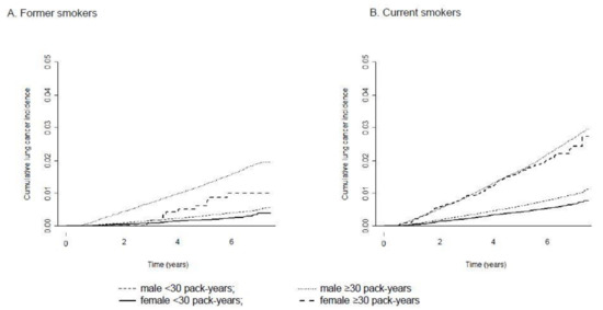 Cumulative lung cancer incidence in men and women according to smoking status and pack-years. (A) Former smokers and (B) Current smokers.