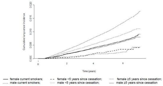 Therefore, we found a higher lung cancer incidence in men than in women with the same level of smoking exposure, suggesting a higher susceptibility for lung cancer in men. Lung cancer risk is positively associated with the duration of smoking and negatively associated with the number of years since smoking cessation according to the HRs for both sexes. Our results highlight the importance of sex difference in the smoking effects on lung cancer, at least in East Asia. Our results imply that sex should be considered in combination with smoking history in the selection of a lung cancer screening target population.