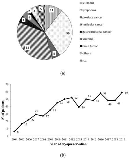 (a) Cancer types from patients counseled for fertility preservation at our center. The percentage of each category is represented. n.a.: data not available. (b) The number of patients being referred for a successful cryostorage progressively over the years.