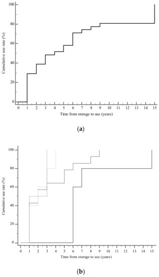 The age of these patients at the time of cryopreservation ranged between 21 and 53 years (average 35.7 ± 7.6 years), and at the time of ART cycle ranged between 26 and 54 years (average 39.0 ± 6.3 years). In comparison to them, men who did not use their frozen sperm and are still banking their material at our center were significantly (p = 0.0212) younger at the time of cryopreservation (31.6 ± 9.9 years). In fact, as it is shown in Figure 2b, younger age at the time of sperm banking was associated with a reduced rate of use—starting after six years from storage—with respect to older men.