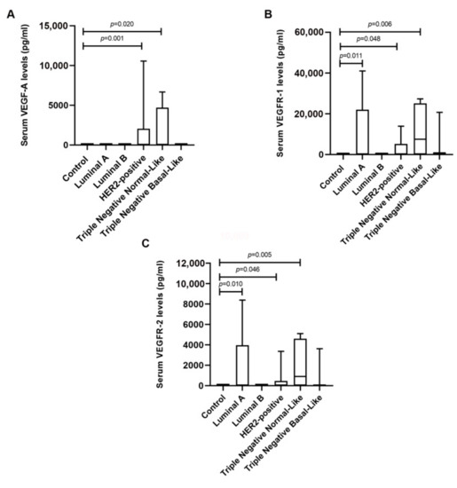 Serum vascular endothelial growth factor A (VEGF-A) levels are significantly increased in cats with HER2-positive and TN Normal-like tumors, while the vascular endothelial growth factor receptor 1 (VEGFR-1) and 2 (VEGFR-2) are significantly elevated in cats with luminal A, HER2-positive and TN Normal-like mammary carcinomas. (A) Box plot analysis of serum VEGF-A, (B) VEGFR-1 and (C) VEGFR-2 levels in the control group and in cats with mammary carcinoma grouped according to their molecular subtype.