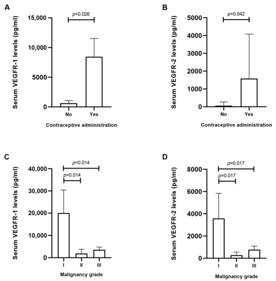 Serum levels of vascular endothelial growth factor receptor 1 (VEGFR-1) and receptor 2 (VEGFR-2) are positively correlated with the use of contraceptives and lower-malignancy tumors. (A,B) Box-plot analysis showing the mean ± SEM of serum VEGFR-1 and VEGFR-2 levels and its correlation with the use of contraceptive drugs and (C,D) tumor malignancy grade.