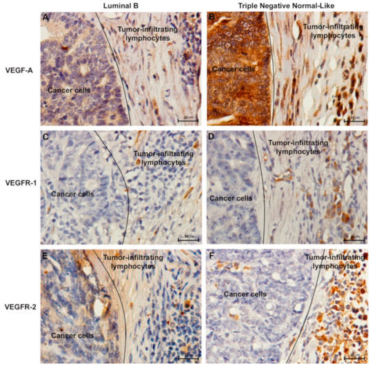 Representative images of immunohistochemical staining of vascular endothelial growth factor (VEGF-A), vascular endothelial growth factor receptor 1 (VEGFR-1) and receptor 2 (VEGFR-2) in tumor infiltrating lymphocytes and cancer cells of feline mammary carcinomas. Luminal B subtype graded as TILs negative for (A) VEGF-A, (C) VEGFR-1 and (E) VEGFR-2. Triple Negative Normal-Like subtype with a TILs-positive score for (B) VEGF-A, (D) VEGFR-1 and (F) VEGFR-2. Original magnification 400×.