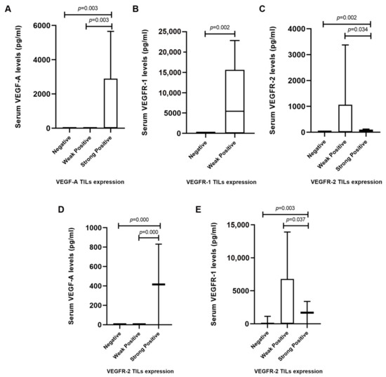 Results also revealed that serum VEGF-A levels were significantly higher in cats showing a strong positive VEGF-A expression in TILs, in comparison to those with a weak positive (p = 0.003) or negative (p = 0.003) score (Figure 4A). Furthermore, a positive association was found between weak positive VEGFR-1 and VEGFR-2 expressions in TILs and their correspondent serum levels (p = 0.002, Figure 4B; p = 0.002, Figure 4C). No significant correlations were found between serum VEGF-A, VEGFR-1, or VEGFR-2 levels and the expression of these proteins in cancer cells (p = 0.712, p = 0.235, p = 0.218, respectively, data not shown). In addition, the expression of VEGFR-2 in TILs was associated with high serum VEGF-A (Figure 4D) and VEGFR-1 (Figure 4E) levels.