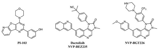 Despite the straightforward rationale of concomitant inhibition of PI3K and mTOR, toxicity concerns have been raised over the blocking of PI3K activity, as this kinase is key in a series of important cellular processes [46]. One of the first compounds of this type to be developed was PI-103 (Figure 3), which provided proof-of-concept for the therapeutic potential of double PI3K/mTOR agents on AML cells by inhibiting leukemic proliferation, clonogenicity of leukemic progenitors, and inducing mitochondrial apoptosis [47] but did not enter clinical trials due to limited solubility and extensive metabolism [48]. Other PI3K/mTOR inhibitors assessed on AML are two imidazoquinoline analogs, dactolisib (NVP-BEZ235) and NVP-BGT226 (Figure 3). Dactolisib is endowed with pan-PI3K/mTOR specificity [49]. When tested on 21 primary AML samples and human leukemic cell lines, the compound reduced their proliferation rate, inducing a strong apoptotic response in AML cells without affecting normal CD34+ progenitor cells’ survival [50]. Interestingly, both NVP-BGT226 and dactolisib suppress AKT signaling pathways and show potent antiproliferative effects, but while NVP-BGT226 has potent pro-apoptotic effects in vitro as well as ex vivo on leukemic blasts, dactolisib causes G1/G0 arrest and prevents the induction of apoptosis [51]. Dactolisib entered a Phase I clinical trial on 22 patients with relapsed or refractory acute leukemia (NCT01756118) in 2012, with an overall response rate of 30% and a sustained molecular remission in a single patient [52].