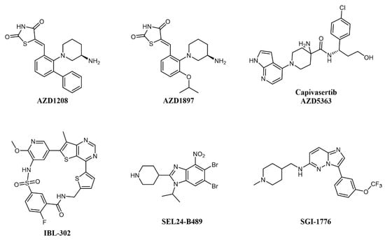 Concomitant dual inhibition of proviral integration site for Moloney murine leukemia virus 1 (PIM1) with other molecular targets has also been proposed as a treatment strategy in AML and evaluated in preclinical studies. PIM proteins are a family of three Ser/Thr kinases responsible for cell cycle regulation, anti-apoptotic activity, and the activation of receptor tyrosine kinases. PIM signaling has a role in defining cell fate, including senescence, cell cycle regulation, apoptosis, metabolism, invasion, and metastasis; PIM1 mRNA levels are increased in acute myeloid leukemia (AML); thus, the combination of a PIM kinase inhibitor with an mTOR inhibitor is expected to offer greater antitumor effects in AML than either inhibitor alone [53]. The combination of dual mTOR inhibitor AZD2014 and pan-PIM inhibitor AZD1208 (Figure 4) effectively reduces protein synthesis by simultaneous inhibition of the mTORC1/2 pathway and induces apoptosis in AML cells [39]. In a similar study, the PIM inhibitor AZD1897 (Figure 4) and the AKT kinase inhibitor AZD5363 (capivasertib, Figure 4) showed synergistic cytotoxicity in AML associated with mTOR and MCL1 pathway repression [54]. It will be interesting to evaluate dual PIM/PI3K inhibitors, such as IBL-202 [55,56] (undisclosed structure) or IBL-302 [57] (Figure 4), in this setting (see also below). SEL24-B489 (MEN1793; Figure 4) is a dual-type I PIM/FLT3 inhibitor based on the benzoimidazole scaffold showing broad activity in AML cell lines and primary AML blasts and efficacy on AML xenografts [58]; SEL24-B489 entered Phase I/II clinical trials on AML in 2017 (NCT03008187). Imidazo-pyridazine SGI-1776 (Figure 4) has a similar selectivity profile and inhibits the growth of both chronic lymphocytic leukemia (CLL) [59] and AML [60] cell lines, but was discontinued after entering clinical trials, including on relapsed/refractory leukemias (NCT01239108), for dose-limiting cardiac toxicity.