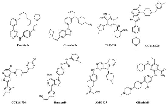 Genetic alterations of FLT3 occur in about 30% of AML cases, more commonly as an internal tandem duplication (FLT3-ITD, 25% of new cases) or as mutations in the tyrosine kinase domain (FLT3-TKD, 7–10% of new cases) [9,61]. In particular, WHO identifies FLT3-ITD as affecting the clinical outcome of AML, conferring poor prognosis, and negatively impacting patient management. [62,63]. As in AML patients, redundant activation of multiple signal transduction pathways, such as PI3K/AKT, MAPK, and JAK/STAT, was observed and linked to poor prognosis early on, the targeting of the oncogenic signal at more than one level in FLT3-targeted therapies has been long recognized as a promising strategy for AML treatment [64]. Dual inhibition of FLT3 in AML has been recently and exhaustively reviewed ([65] and references within); we will focus here on compounds with specific dual kinase inhibitory profile which have undergone clinical investigations in AML.