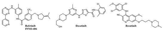 There are eight structurally related SFKs; the family is involved in RTKs, integrin, GPCRs, and immunoreceptor signaling [107]. Interestingly, the domain organization of ABL and SRC has significant homology [108], making possible the development of dual ATP-competitive SRC-ABL inhibitors. There are now five commercially available tyrosine kinase inhibitors for the treatment of Ph+ CML: imatinib, dasatinib, nilotinib, bosutinib, and ponatinib; of these, dasatinib and bosutinib (Figure 6) are dual SRC-ABL inhibitors [96]. Other advanced dual SRC-ABL inhibitors include FB2, a N-(thiazol-2-yl)pyrimidin-4-amine derivative (structure not completely disclosed) which shows in vitro and in vivo activity against TKI-resistant CML cell lines [109,110], and bafetinib (INNO-406, NS-187; Figure 6), an orally available inhibitor with activity on a number of ABL mutations which also selectively inhibits Lyn over other SRC family members and is able to penetrate the central nervous system (CNS) in murine models [111,112]. In a Phase I clinical trial on CML patients resistant or intolerant to imatinib and second-generation inhibitors, bafetinib achieved a 19% cytogenetic response rate [113]. Dasatinib (BMS-354825; Figure 6) was the first dual SRC-ABL inhibitor to enter the clinic and was developed starting from a series of substituted thiazole-5-carboxamides with activities against SRC and ABL and antiproliferative activity in CML cell lines and xenograft models [114]; besides SRC and ABL, dasatinib binds over 30 kinases, including major regulators of the immune system [115]. Dasatinib was initially approved in 2006 for the treatment of CML and Philadelphia-positive acute lymphoblastic leukemia (Ph+ ALL) patients resistant to therapy, including imatinib [116]; when compared with imatinib in a Phase III clinical trial at a dose of 100 mg/day, it showed higher molecular response rates [117]. Dasatinib has been the object of more than 300 clinical trials on CML and a number of other pathologies [118]. More recent clinical trials have shown encouraging efficacy of dasatinib at a lower dose, suggesting that future CML treatment could have a better safety profile and lower cost of care [119].
