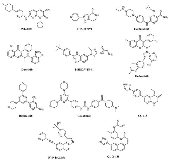 The involvement of class I PI3Ks in the onset of B-cell lymphoma is well documented [147]. First-generation pan-PI3K inhibitors have shown limited clinical efficacy in hematological cancers, probably due to unspecific inhibition of all isoforms and ensuing toxicity. Recently, isoform-selective inhibitors have shown better therapeutic efficacy. Duvelisib (IPI-145, INK-1197; Figure 7) is a dual PI3Kδ/γ quinoline inhibitor that shows selectivity over other class I PI3Ks [148,149]. In a Phase I trial in CLL patients, 56% and 83% responses were observed in chemotherapy-resistant and treatment-naïve patients, respectively. Similar results were obtained in a Phase II study in FL patients and a larger Phase III trial in patients with advanced hematological diseases, including NHL. The compound has now been approved by the FDA for the treatment of CLL and FL patients relapsed or refractory to chemotherapy [150,151]. PI3KD/V-IN-01 is a compound that simultaneously and selectively inhibits PI3Kδ and PIK3C3/Vps34, a class III PI3K isoform that can induce cytoprotective autophagy [152]. The compound showed superior antiproliferative activity against AML, CLL, and Burkitt’s lymphoma primary cells, compared to a PI3Kδ-only inhibitor (idelalisib) and inhibited tumor growth in vivo. Another PI3Kδ inhibitor, umbralisib (TGR-1202; Figure 7), also blocks casein kinase-1ε (CK1ε). Targeting of CK1ε has been shown to cooperate with idelalisib in hematological malignancies and to alleviate some immune-mediated adverse effects observed with pan-PI3K inhibitors. Thus, umbralisib was shown to possess comparable antitumor activity but lower toxicity in murine models of CLL [153]. The drug is being evaluated in CLL and B-cell NHL patients with encouraging results [154,155].