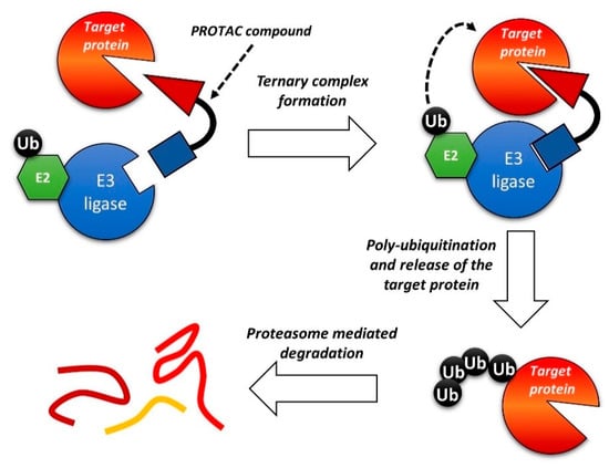 One of the most interesting recent developments in this field relates to Proteolysis Targeting Chimeras (PROTACs) compounds. It is a new class of bifunctional molecules, composed of 1) a ligand that binds a biomolecular target; 2) a ligand that recognizes the E3 ubiquitin ligase; 3) a linker between 1 and 2 [183,184,185,186,187]. The interaction with E3 ubiquitin ligase promotes the ubiquitination of the biomolecular target and, consequently, the degradation of the protein by the proteasome. By this mechanism, PROTACs can reduce the intracellular concentration of a given protein, leading to a prolonged and marked inhibitory effect. Despite the very recent development of such a strategy, several papers and reviews on the PROTACs strategy can be found in the literature [188,189,190,191]. A general scheme of the PROTACs strategy is reported in Figure 9.
