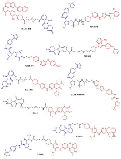The enhancement in the selectivity of PROTAC derivative of kinase inhibitor was also observed for a quizartinib-based PROTAC, that resulted active both in vitro and in vivo against AML models [198]. The compound (named FLT-PROTAC; Figure 10) was able to abrogate the FLT3-ITD expression and showed higher efficacy than quizartinib in vitro and an MV4-11 xenograft model.