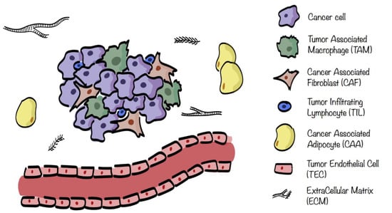 The different stromal cells of the TME are cancer associated fibroblasts (CAFs), tumor endothelial cells (TECs), mesenchymal stem cells (MSCs), cancerassociated adipocytes (CAAs), and infiltrating immune cells (ICs), including tumorassociated macrophages (TAMs), natural killers (NKs), neutrophils, dendritic cells (DCs), and tumor infiltrating lymphocytes (TILs), see Figure 1. These cells are characterized by specific metabolic traits and pathways that, depending on the surrounding situation, get modulated not only in cancer cells, but also within the TME [4,7].