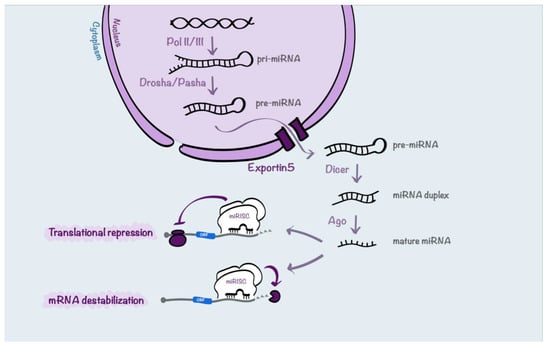 MiR biogenesis is a complex process (Figure 2). Firstly, miRs are mainly transcribed by RNA polymerase II into primary transcript precursors (pri-miRNAs) that can range from hundreds to thousands nucleotides long. Next, pri-miRNAs are endonucleolytically cleaved in the nucleus by the RNases III Drosha and Pasha to generate ~70 nucleotides long hairpin pre-miRNAs. Then, the resulting precursors are actively exported from the nucleus to the cytoplasm by Exportin5, working with its cofactor Ran-GTP. In the cytoplasm, the RNase III Dicer recognizes the pre-miRNAs, cleaves off their loops and generates 20–22-nucleotides long miRNA duplexes characterized by two nucleotides protruding at each 3′-end. At this point, the functional strand of each mature miR is loaded into ribonucleoprotein complexes (miR-induced silencing complexes, miRISCs) together with the proteins from the Argonaute (Ago) family. Once loaded onto miRISC complexes, mRNAs may be silenced by cleavage, translational repression, or deadenylation [60].