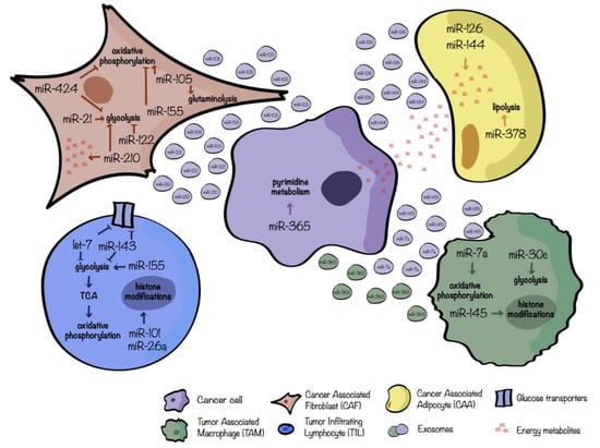 An in-depth knowledge of the molecular mechanisms involved in the regulation of the metabolic crosstalk between cancer and non-malignant cells present in the TME and how stromal cells rewire their metabolism may pave the way for new therapeutic breakthroughs. In the present review, we examine recent insights into how miRs mediate this metabolic shaping of the TME by repressing metabolic enzymes, transporters, and other metabolic regulators.