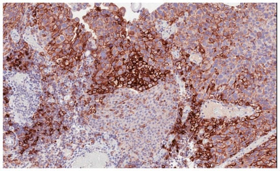 Immune checkpoint inhibitors have become an increasingly used therapeutic option in many solid tumors [5,6,7,8,9,10]. In bladder cancer, high levels of programmed death-ligand 1 (PD-L1) expression (Figure 1) have been reported to be associated with advanced and aggressive tumors with poor survival outcomes [11,12].