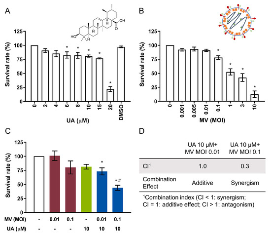 Ursolic acid (UA) and oncolytic measles virus (MV) are cytotoxic to human breast cancer MCF-7 cells and synergistically induce anticancer activity. (A) MTT cell viability analysis of MCF-7 cells treated with UA (2–20 µM) for 5 days. (B) MTT cell viability analysis of MCF-7 cells treated with MV (multiplicity of infection, MOI 0.001–10) for 5 days. (C) MTT cell viability analysis of MCF-7 cells treated with UA (10 µM) and MV (MOI 0.01 or 0.1) concurrently for 5 days. (D) Analysis of treatment synergism using the Chou–Talalay method wherein combination index (CI) value quantitatively defines synergism (CI < 1), additive effect (CI = 1), or antagonism (CI > 1). All data shown are means ± SEM from three independent experiments; * p < 0.05 in (A,B) compared to ‘0’; * p < 0.05 compared with MV MOI 0.01 or 0.1, # p < 0.05 compared with UA treatment only in (C); DMSO = 0.2% (the maximum concentration of DMSO used).