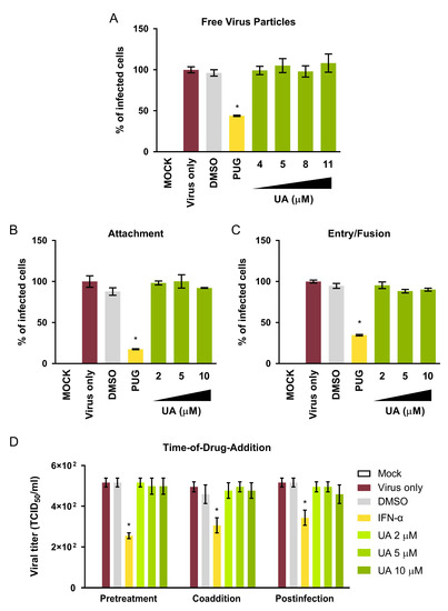 UA treatment does not interfere with the infection of oncolytic MV. (A) Effect of UA (4, 5, 8 and 11 µM) on free MV particles. (B) Effect of UA (2, 5 and 10 µM) on MV attachment. (C) Effect of UA (2, 5 and 10 µM) on MV entry/fusion. (D) Time-of-drug-addition analysis of UA treatment on MV infection. For (A–C), viral reporter fluorescence intensity reflecting the infectivity was measured using a variable mode scanner at 72 h post-infection. For (D), supernatants from the experiment were collected at 72 h post-infection for viral titration using 50% tissue culture infective dose (TCID50). For all assays, final MV concentration = MOI 0.1; DMSO = 0.1% (the maximum concentration of DMSO used); 50 µM punicalagin (PUG) for (A–C) or 1000 IU/mL interferon-α (IFN-α) for (D) was included as a positive control. All data shown are means ± SEM from three independent experiments; * p < 0.05.