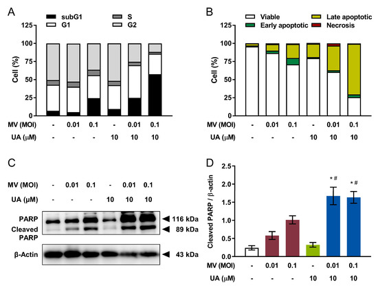 Cell cycle and apoptosis analyses were next performed to study the mechanism underlying the anticancer activity of UA and oncolytic MV combinatorial treatment on MCF-7 cells. Compared to cells treated with UA or MV alone, the combinatorial treatments caused synergistic elevation in the population of sub-G1 phase cells to approximately 25% and 60% for MOI 0.01 and MOI 0.1 of oncolytic MV, respectively (Figure 3A). Increased sub-G1 population suggesting apoptosis [27] was subsequently validated by flow cytometric Annexin V/Propidium iodide (PI) double staining. Percentage of late apoptotic cells detected in MCF-7 cells treated with UA and MV in combination significantly increased to 33–69% compared to 20% or less when treated with each agent alone (Figure 3B). These results were further confirmed via western blot analysis of the apoptotic marker, cleavage of poly (ADP-ribose) polymerase (PARP) [28]. Consistently, our finding revealed increased apoptosis as level of cleaved PARP was greatly enhanced by UA and oncolytic MV combinatorial treatments (Figure 3C,D). Overall, our results demonstrated that UA and oncolytic MV combinatorial treatment produces synergistic anticancer effect against MCF-7 breast cancer cells, which is mediated by increased induction of apoptotic cell death.