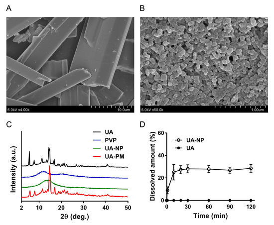 Physicochemical properties of UA nanoparticles (UA-NP). (A) Field emission scanning electron microscopy (FESEM) photograph of non-formulated UA (magnification: 4000×; scale bar = 10.0 μm). (B) FESEM photograph of nanoformulated UA (magnification: 50,000×; scale bar = 1.0 μm). (C) X-ray diffraction patterns of UA, polyvinylpyrrolidone (PVP), nanoformulated UA nanoparticles (UA-NP), and UA-PVP physical mixture (UA-PM). XRD patterns were taken from 2° to 50° with a scanning rate of 4°/min. The spectra were offset for clarity. (D) Drug dissolution test (open circle, UA-NP; filled circle, UA). Samples containing 4.68 mg equivalent of UA were placed in 100 mL of pH 7.4 phosphate buffer and maintained at 37 ± 0.5 °C. During the dissolution process, samples were withdrawn at 0, 1, 10, 20, 30, 60, 90 and 120 min for HPLC analysis. Data points are expressed as means ± SD (n = 6).