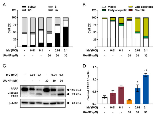 UA-NP and oncolytic MV co-treatment induces enhanced apoptotic cell death in human breast cancer MCF-7 cells. MCF-7 cells were first concurrently treated with UA-NP (30 µM) and MV (MOI 0.01 or 0.1) for 5 days, then analyzed by flow cytometry for (A) cell cycle distribution and (B) apoptosis induction as in Figure 3A,B. (C) Lysates of MCF-7 cells co-treated with UA-NP (30 µM) and MV (MOI 0.01, or 0.1) for 5 days were also analyzed for PARP cleavage by western blot. (D) Quantitation of the relative level of cleaved PARP from (C). All quantitative data are expressed as means ± SEM from three independent experiments; * p < 0.05 compared with MV MOI 0.01 or 0.1, # p < 0.05 compared with UA treatment only.