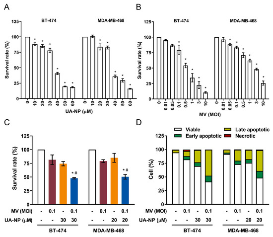 Combination treatment using UA-NP and oncolytic MV exerts enhanced anticancer effect against human breast cancer BT-474 and MDA-MB-468 cells. BT-474 and MDA-MB-468 cells were treated with (A) UA-NP (10–60 μM) or (B) MV (MOI 0.01–10) for 5 days before analysis of cell viability using MTT assay. DMSO = 0.1%. (C) BT-474 and MDA-MB-468 cells were co-treated MV (MOI 0.1) and/or UA-NP (30 μM for BT-474 and 20 μM for MDA-MB-468), following which cell viability was determined by MTT assay. (D) BT-474 and MDA-MB-468 cells were first concurrently treated with UA-NP (30 or 20 µM) and MV (MOI 0.1) for 5 days, and then analyzed by flow cytometry for apoptosis induction. Data shown are means ± SEM from three independent experiments; * p < 0.05 in (A,B); * p < 0.05 compared with MV MOI 0.01 or 0.1, # p < 0.05 compared with UA treatment only in (C).
